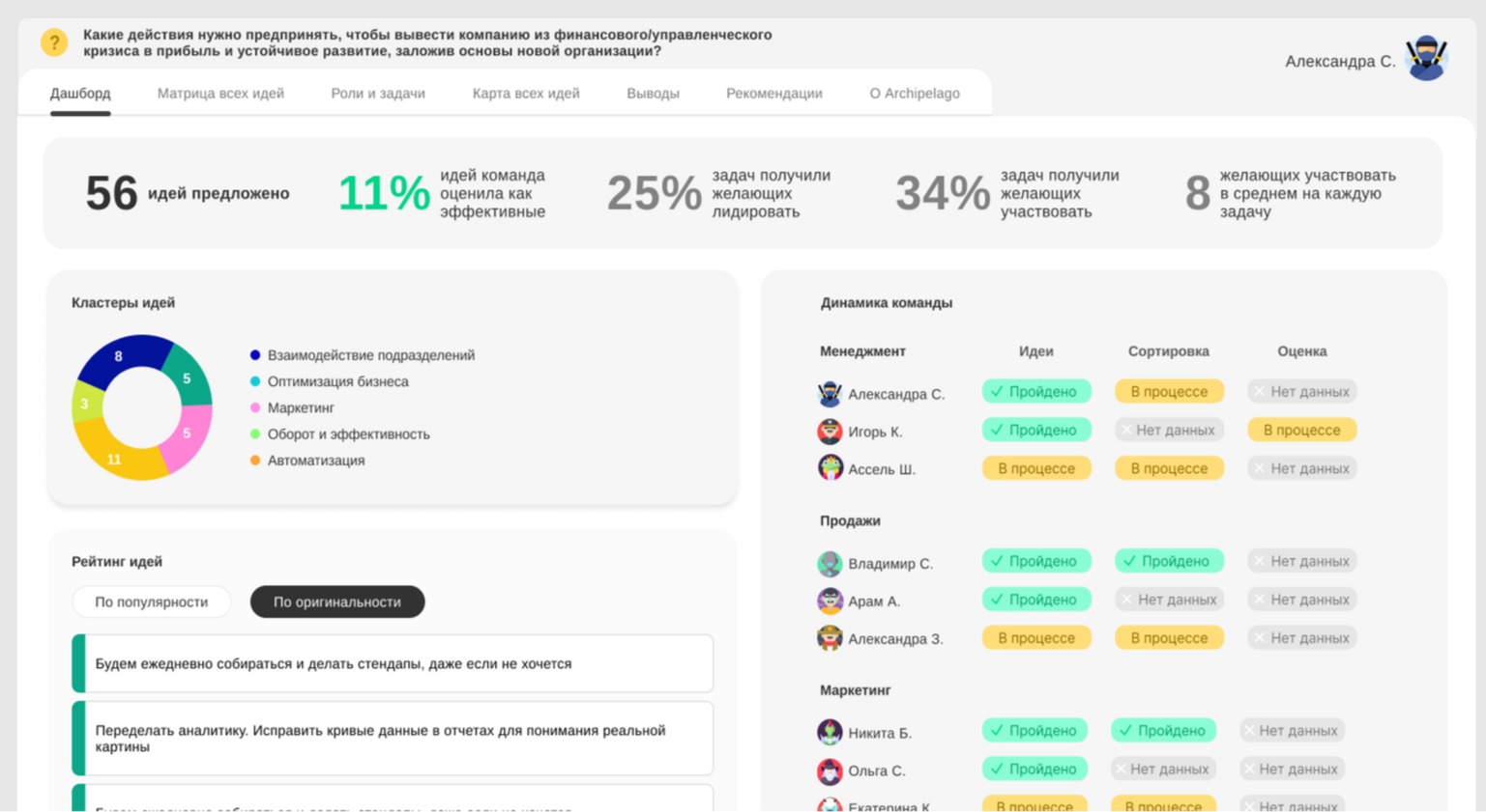 Выявляет сотрудников, чьи идеи находят наибольшую поддержку в команде.